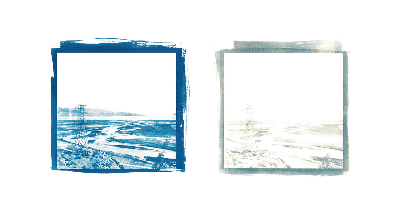 Today, the image of hydroelectric dams - both existing and speculative - is mobilised to exert symbolic, regional power through the production of scarcities. Just as the fluctuating reservoir levels bleach the surrounding landscape, this process of bleaching is used in the making of the fading cyanotypes. The print thus becomes a material expression of the very processes it images.